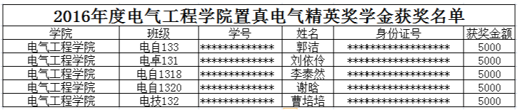 2016年度电气工程学院置真电气精英奖学金获奖名单